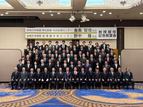 2026年2月22日、ホテルニュー長崎にて、金高賢悟先生、野中隆先生の教授就任記念祝賀会が開催されました。 当日は多くの先生方にご参集いただき、終始和やかな雰囲気の中で、大変意義深い会となりました。 両先生のこれまでのご功績を改めて実感するとともに、外科学講座としての新たな門出を皆で共有する貴重な機会となりました。 今後のさらなるご活躍と、外科学講座のますますの発展を心よりお祈り申し上げます。